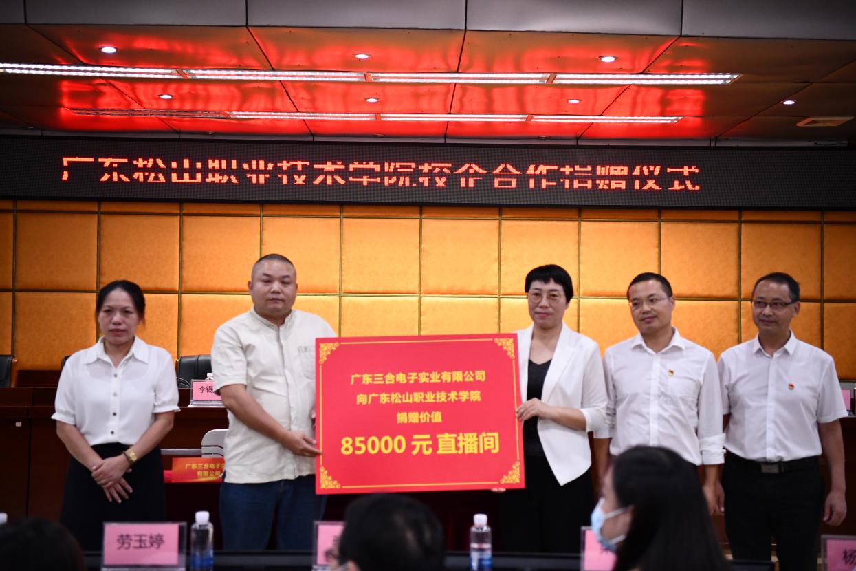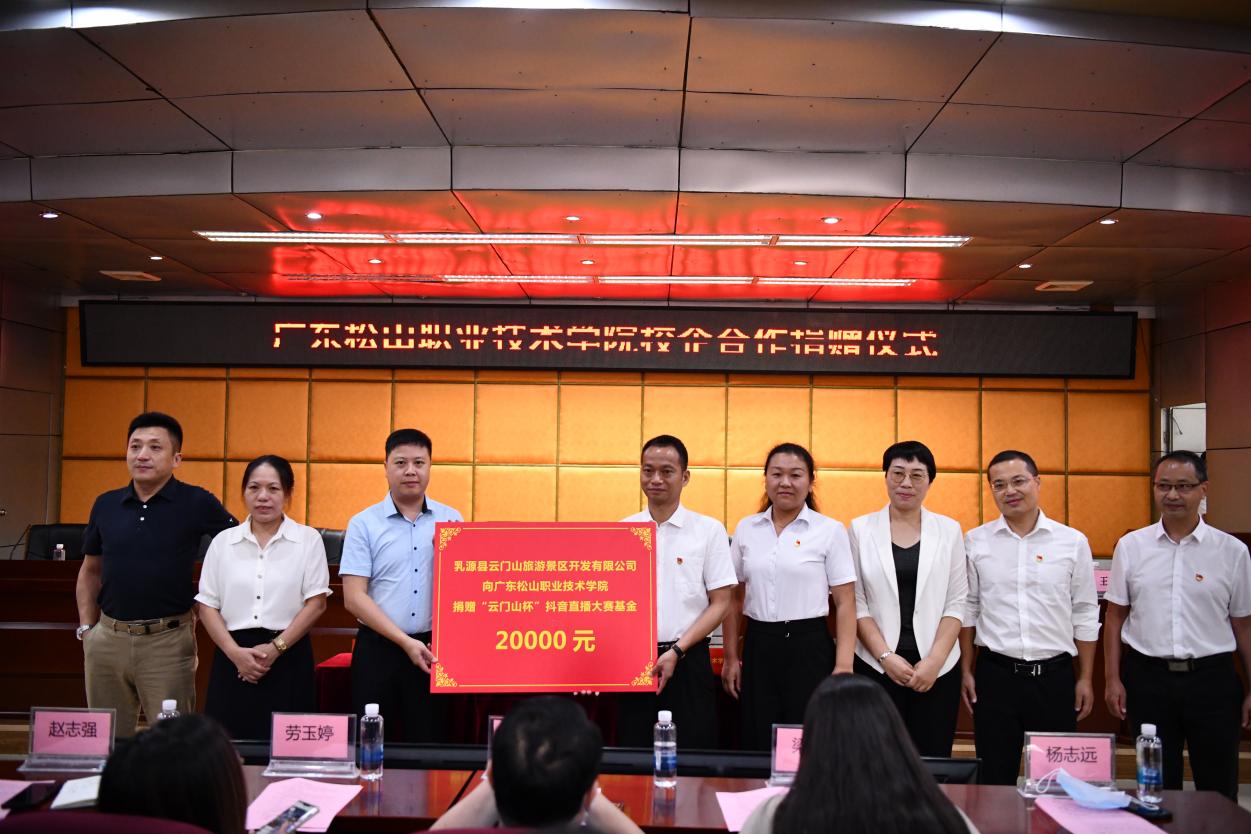 接着,会议举行捐赠仪式,由乳源县云门山旅游景区开发有限公司和广东三合电子实业有限公司分别向学校捐赠“云门山杯”抖音直播大赛基金2万元以及价值8万5千元直播间。王玉贤和外语商务学院副经理高恒冠代表学校与捐赠企业代表签订捐赠协议并合影留念。