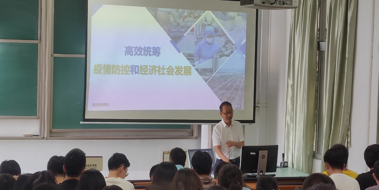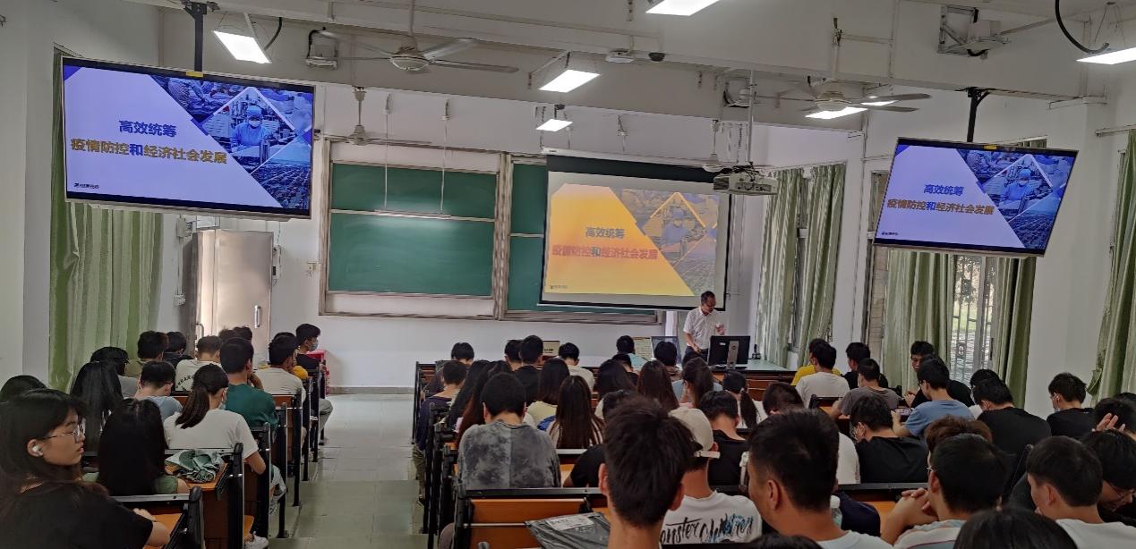 9月22日下午,suncitygroup太阳新城党总支书记刘攀桂以“防住疫情,稳住经济,守住安全”为主题主讲了2022年秋季学期的“书记经理第一课”,学院2020级信息安全与管理班、计算机网络技术班共115名同学参加讲座。